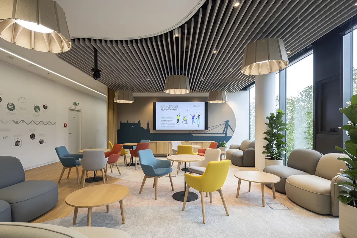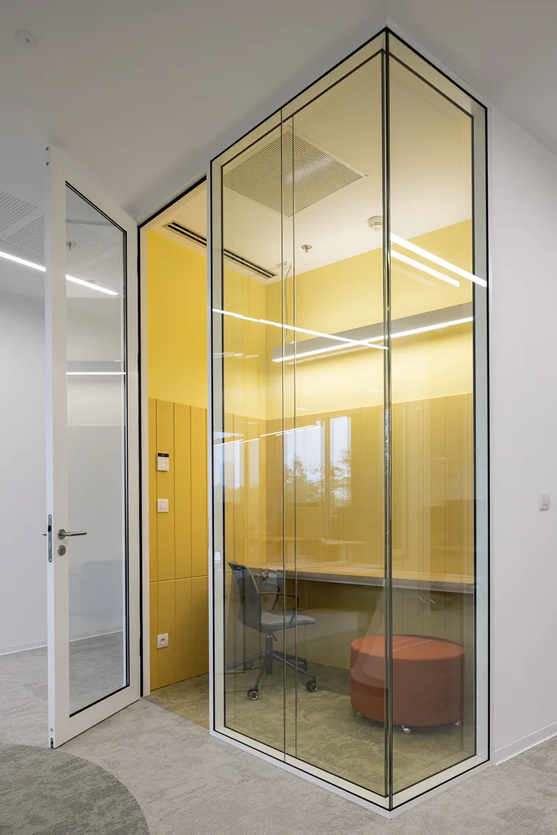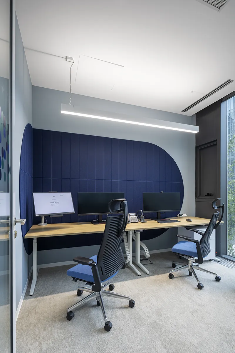 Kancelárie sú vybavené modernými výškovo nastaviteľnými stolmi, perfektne doladenou farebnosťou v jednotlivých zónach a relaxačnou zónou, ktorú možno oddeliť závesom pre väčšie súkromie.