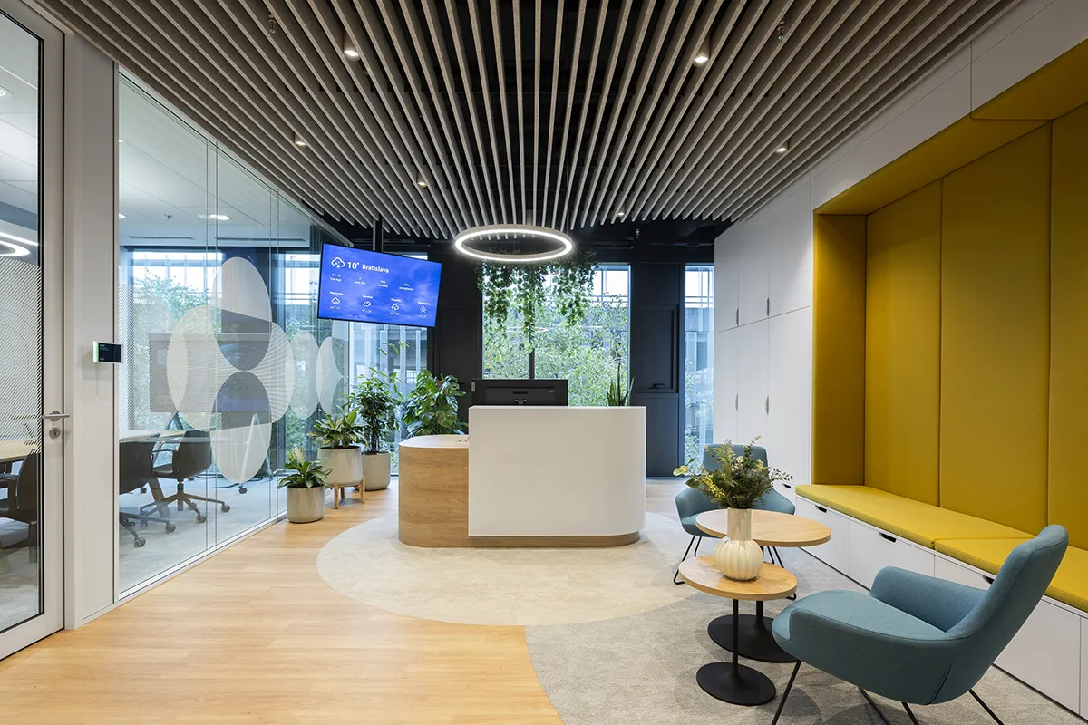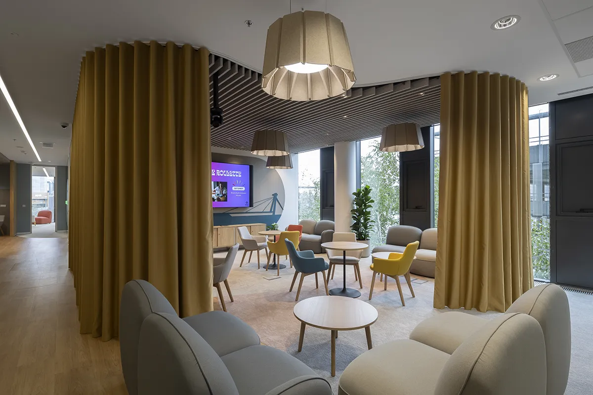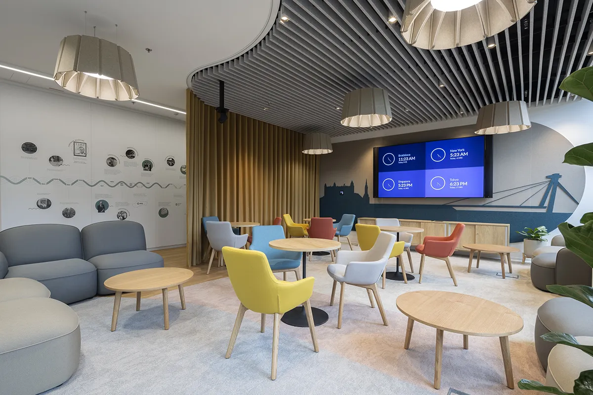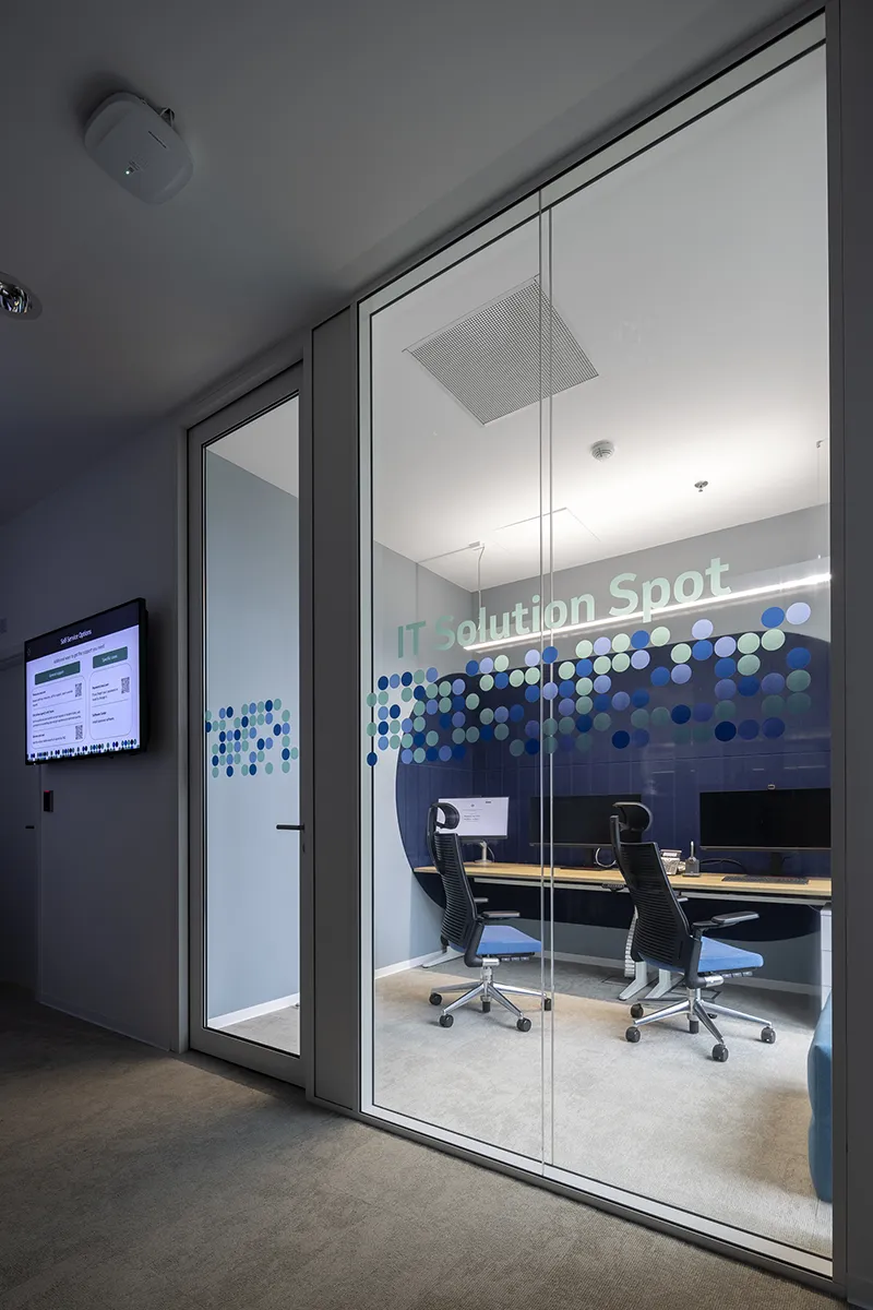 Kancelárie sú vybavené modernými výškovo nastaviteľnými stolmi, perfektne doladenou farebnosťou v jednotlivých zónach a relaxačnou zónou, ktorú možno oddeliť závesom pre väčšie súkromie.