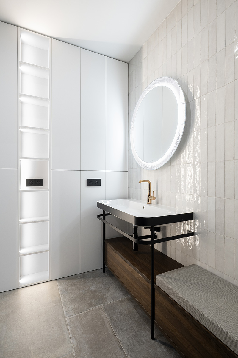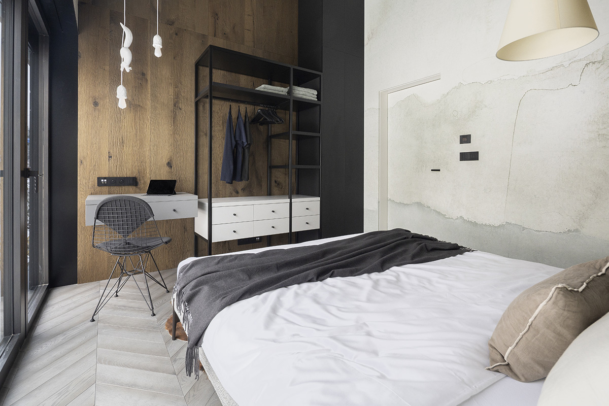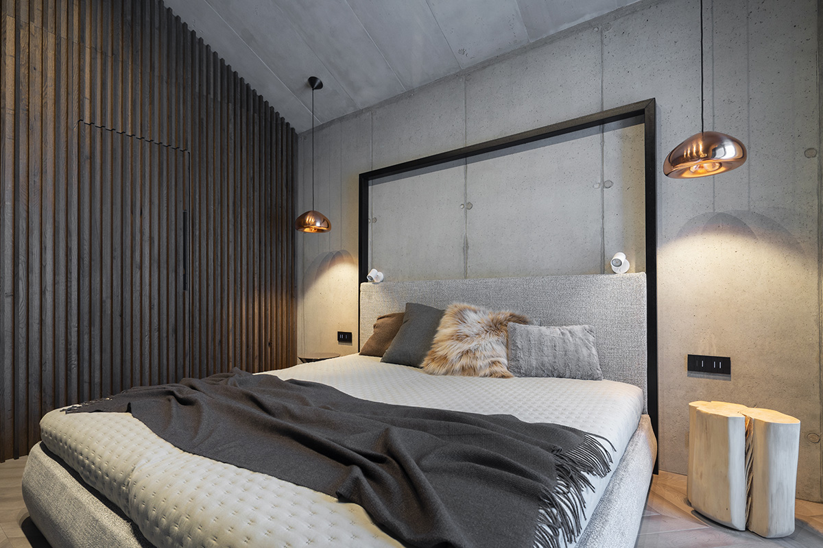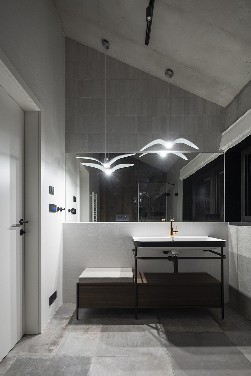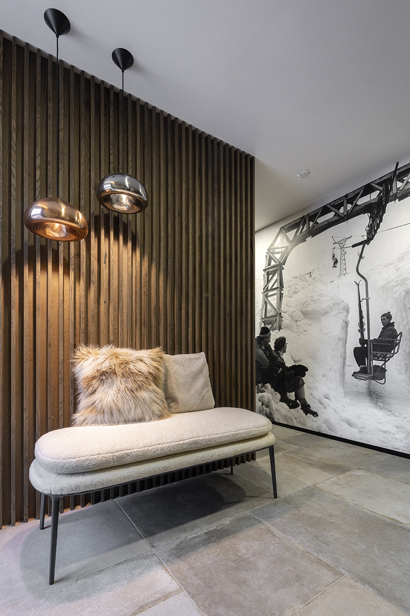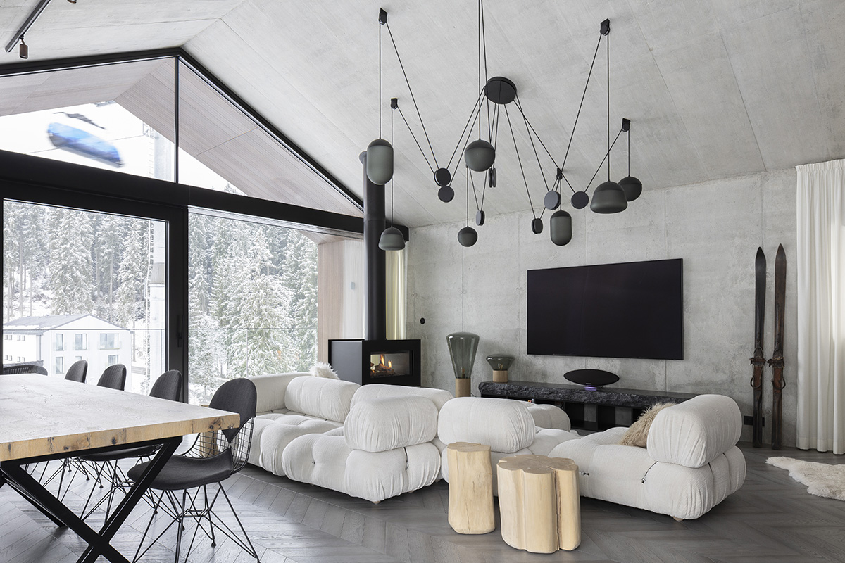 Atmosféru hlavného obytného priestoru dopĺňa stropná inštalácia evokujúca planéty na nočnej oblohe, zatiaľ čo organický tvar pohovky pripomína zhluk snehových gúľ. Obytné priestory pracujú prevažne s tmavšími tónmi materiálov, ktoré vytvárajú intímnu a teplú atmosféru. Naopak kúpeľne, často bez priameho denného svetla, sú riešené v svetlej farebnosti s bielymi obkladmi, lesklými povrchmi a zaoblenými zrkadlami.