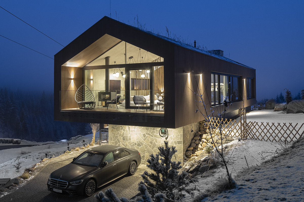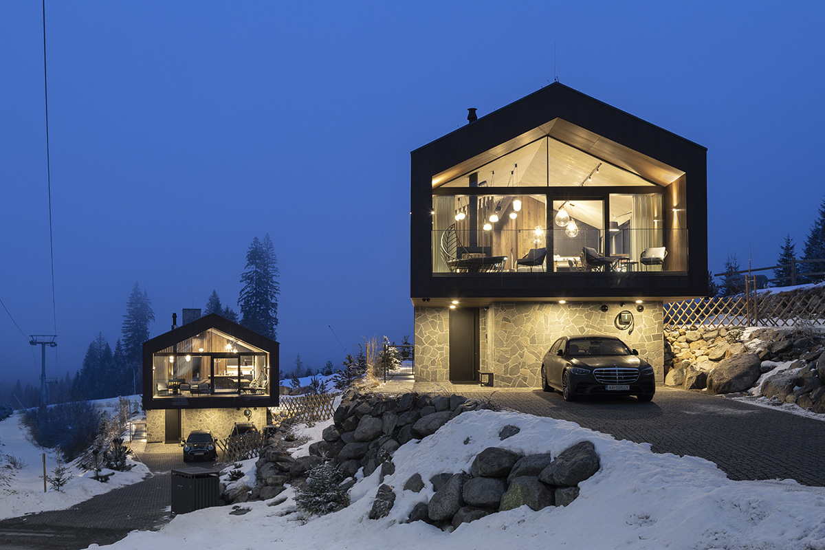 Dve identické chaty sa nachádzajú vo vyhľadávanom lyžiarskom stredisku Jasná v Národnom parku Nízke Tatry. Hoci chaty zdieľajú jednotný architektonický koncept a interiérový dizajn, v ich prvom nadzemnom podlaží je zavedená len drobná úprava, ktorá lepšie reaguje na konkrétne praktické potreby klienta. Jedinečná poloha s priamym výhľadom na dominantnú horu Chopok sa stala kľúčovým východiskom pre návrh dispozičného riešenia aj charakter interiéru. Projekt pôvodne vznikol ako súčasť menšieho developerského zámeru s jednotným architektonickým konceptom. Po dôkladnej analýze urbanistickej situácie a praktických potrieb klienta však došlo k zásadnej úprave pôdorysov. Táto transformácia sa premietla aj do fasád oboch objektov, ktoré boli otvorené veľkoformátovými preskleniami orientovanými na panorámu okolitých hôr.