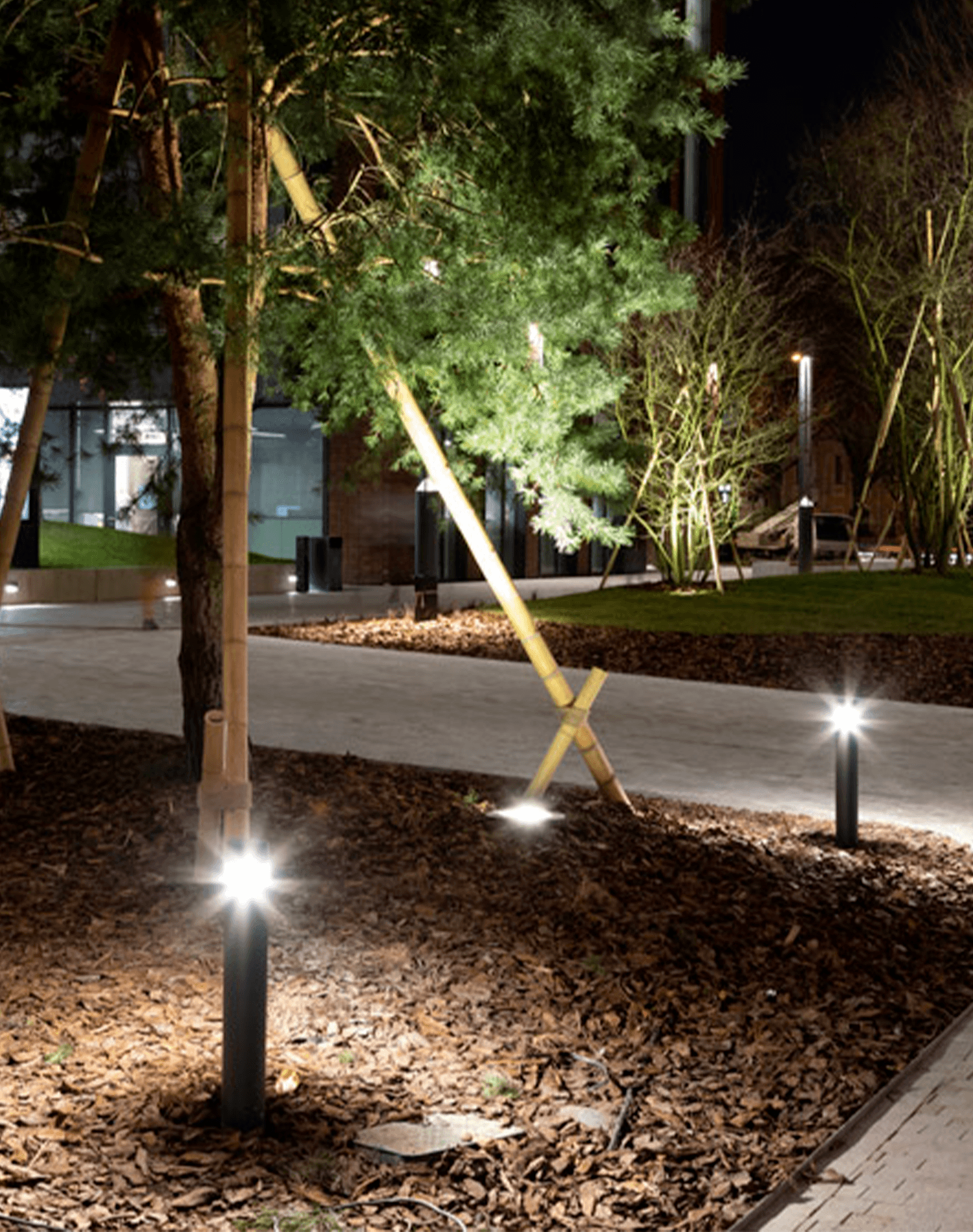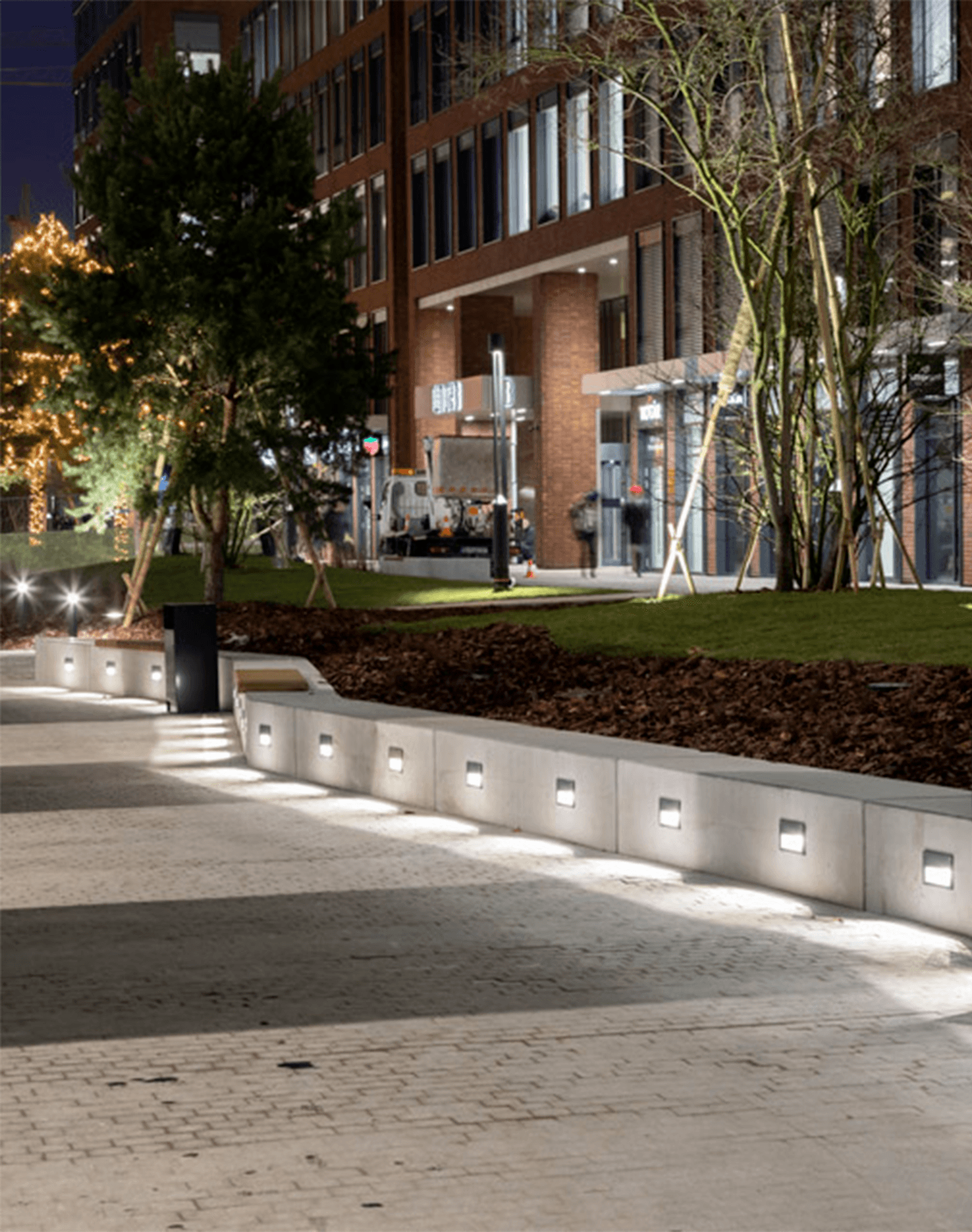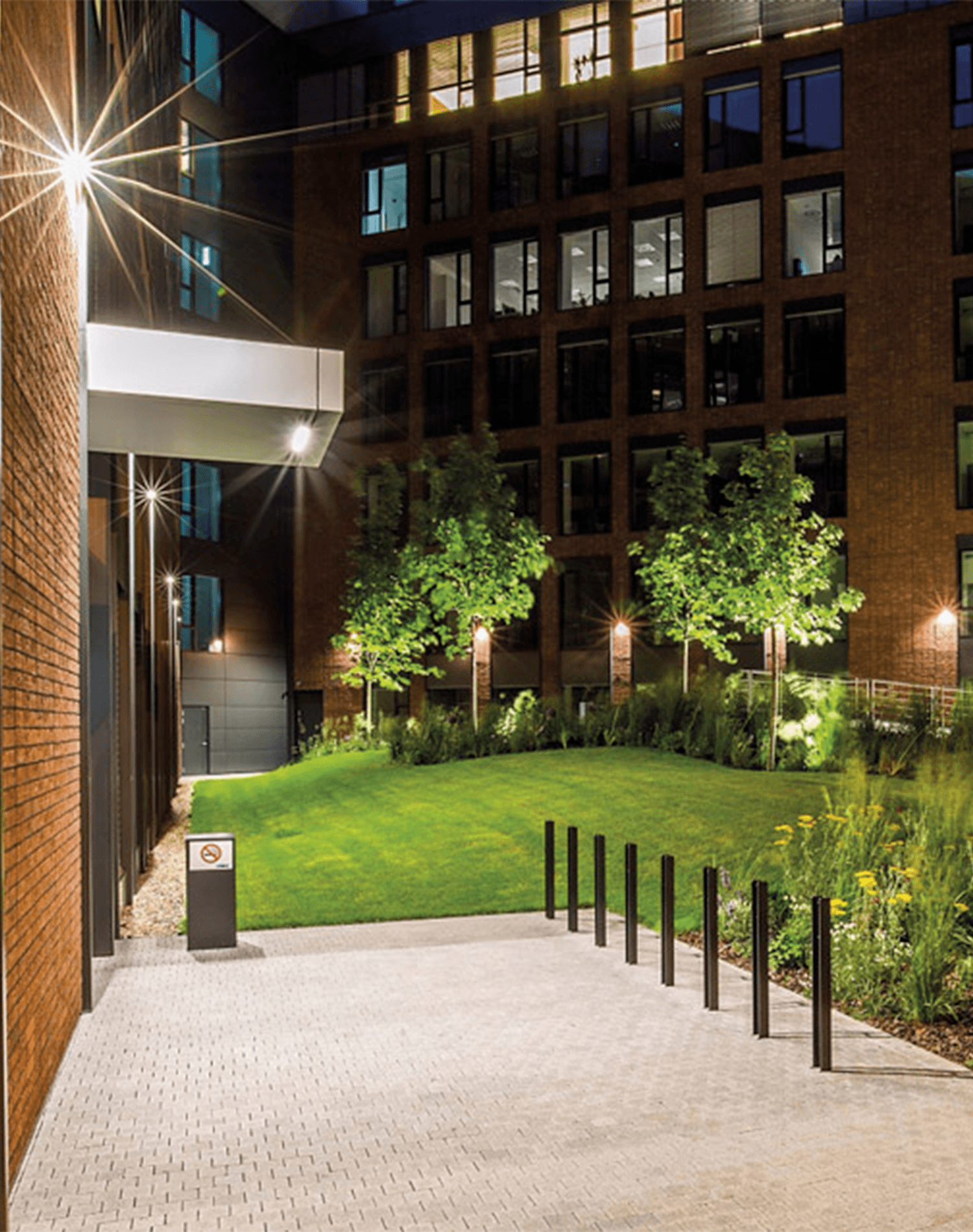 Osvetlenie vonkajších priestorov objektu harmonizuje s jeho celkovým charakterom a prispieva k bezpečnému pohybu chodcov.